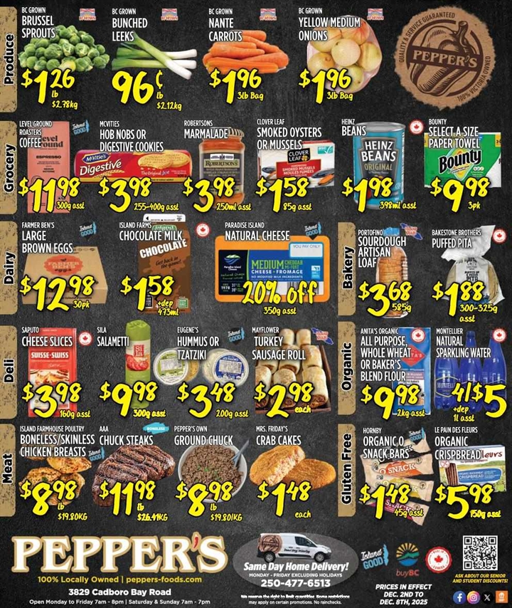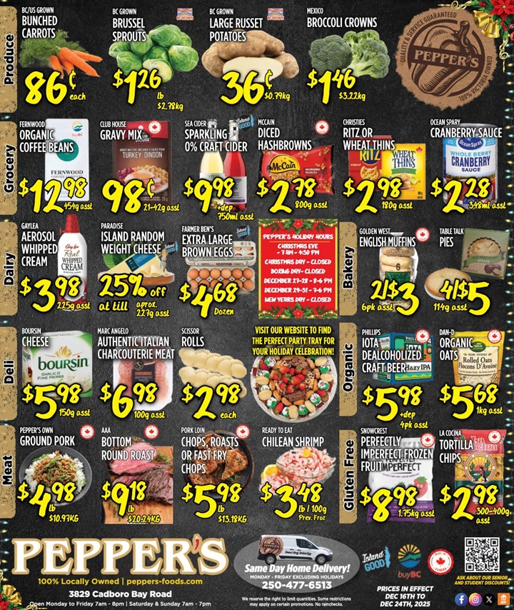 Monday – Friday, excluding holidays. A minimum of $50 is required and delivery must be within a 5km radius.